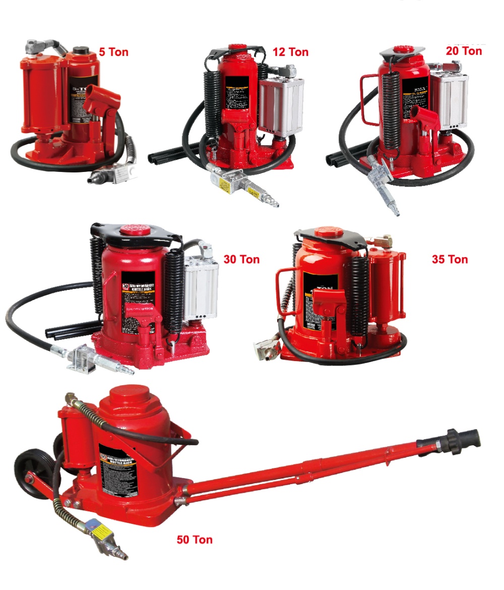 The Air/Hydraulic Bottle Jack offers optional lifting capacities of 5T, 12T, 20T, 30T, 35T, and 50T, making it suitable for a wide range of heavy-duty applications. Built with heavy-duty steel construction, it provides exceptional stability and strength. Featuring both manual and pneumatic lifting operations, this jack is easy to use for repairs and operations. Ideal for automotive, truck, farm, industrial, and construction use, it delivers reliable performance for demanding lifting tasks.