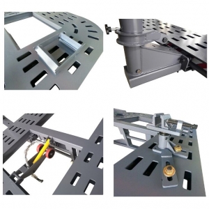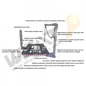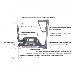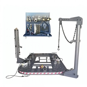 Auto Body Shaping Equipment is a hydraulic tilt lifting bench with adjustable flexible legs for efficient loading and unloading of collision-damaged vehicles. The workbench, constructed with dual 10mm-thick manganese steel plates, ensures robust durability for heavy-duty pulling operations. Featuring 360-degree rotatable posts, four universal clamps, and streamlined gripping devices, it adapts to diverse vehicle damage types for rapid fixation.