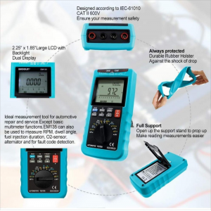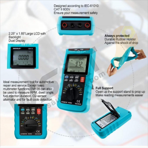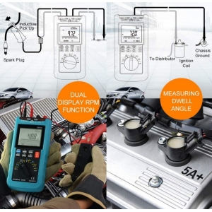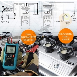 It can be used to measure RPM, Dwell angle, fuel injection duration, o2-sensor, alternator and for fault code detection.