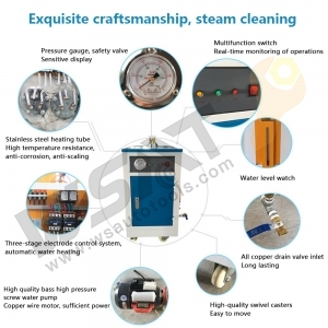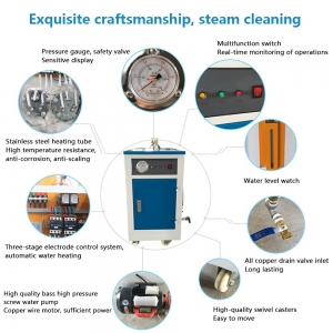 Independent water and electricity box, convenient maintenance, safe and reliable; high temperature and high pressure water pump can extract condensing hot water and save electric energy; Triple safety guarantee of temperature, water level, pressure and safety valve; Temperature, water level and pressure can be adjusted according to need, and power can be adjusted in four grades.