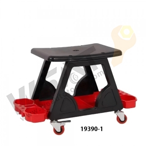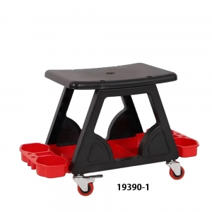 The stool is equipped with storage trays on both sides and a sliding drawer to accommodate various tools.