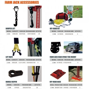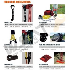 The Farm Jack Accessories are designed to enhance the functionality and versatility of your farm jack. These accessories typically include components like base extensions, lifting straps, mounting brackets, and carrying cases, all intended to make your farm jack more effective for various lifting, pulling, and towing tasks. Ideal for use in agricultural, off-road, and industrial environments, these accessories ensure your farm jack performs reliably and efficiently in different applications.