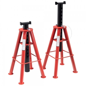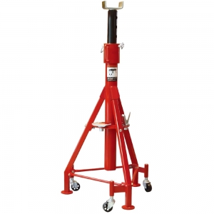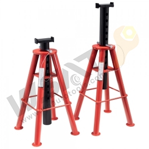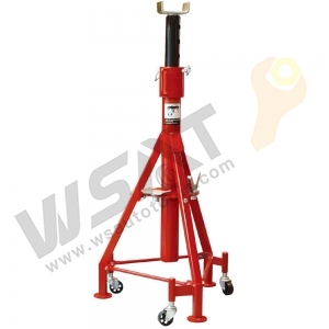 The Heavy-Duty High Height Pin Type Vehicle Support Stand features a robust four-leg steel base, constructed from heavy schedule pipe for enhanced strength and stability. It allows for quick and easy height adjustment to suit different lifting needs. The large saddle with locating lugs ensures secure positioning, while the V-shaped saddle is specifically designed to cradle axles or other under-truck components, providing firm support during maintenance and repairs.