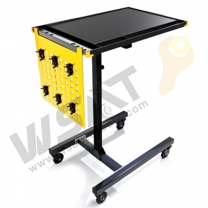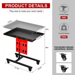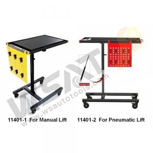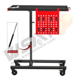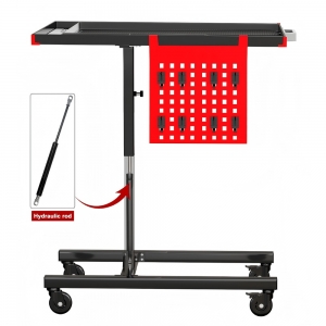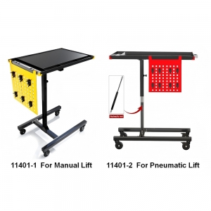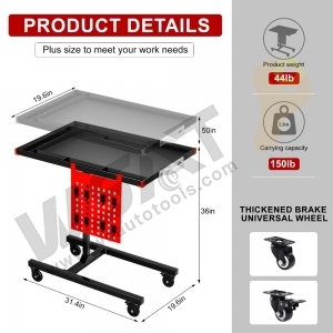 Multifunctional Manual/Automatic Mobile Work Table, height-adjustable to suit most vehicles, featuring a multi-functional top table with 3 compartments and 7 screwdriver holes. Equipped with thickened brake universal wheels for smooth mobility. Optional pneumatic lift with a hydraulic rod for added convenience.