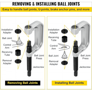 Designed to effortlessly remove press-fit parts including ball joints,U-joints,brake anchor pins,and more on most 2-wheel drive(2WD)and 4-wheel drive(4WD)vehicles without removing the control arm from the vehicle.