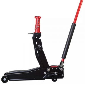 The SUV Low-Profile Foldable Floor Jack with Double Pump is designed for professional use, offering both low profile and high lifting capabilities. Its fast lift feature allows for quick raising without load, while the sealed cast iron pump base operates twin pistons for faster lifting action. The reinforced structural lifting arm and thick U-channel frame side plates ensure solid performance for even the toughest jobs. Equipped with rear casters that pivot 360 degrees, it provides easy positioning and maneuverability. The heavy-duty two-piece grip offers comfortable handling, and the foam bumper protects the vehicle finish from damage. With easy and quick height adjustments, this jack is versatile enough for both low-chassis light-duty cars and high-chassis heavy-duty vehicles, making it suitable for a wide range of applications.