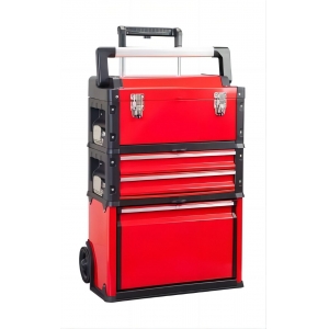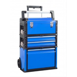 Bottom section has a tilt drawer storage cabinet with the back housing the 2 wheels and the collapsible, telescopic handle with a comfort grip; Each section can be separated or connected depending on your tool storage needs.