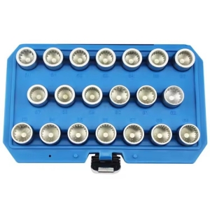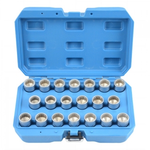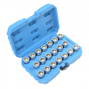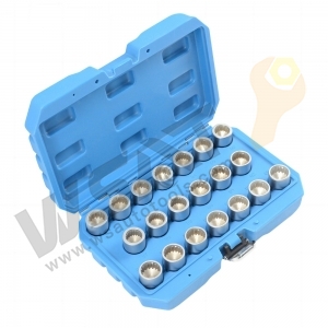 20 PCS wheel nut removal socket 50 /14PT 51/15PT, 52/16PT, 53/17PT, 54/18PT, 55/19PT, 56/20PT, 57/21PT, 58/22PT, 59/23PT, 60/14PT, 61/15PT, 62/16PT, 63/17PT, 64/18PT,65/19PT, 66/20PT, 67/21PT, 68/22PT, 69/23PT. The kit does not contain a wrench tool.