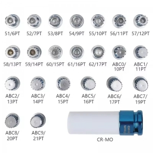 51/6PT, 52/7PT, 53/8PT, 54/9PT, 55/10PT, 56/11PT, 57/12PT, 58/13PT, 59/14PT, 60/15PT, 61/16PT, 62/17PT, ABC0/10PT, ABC1/11PT, ABC2/13PT, ABC3/14PT, ABC4/15PT, ABC5/16PT, ABC6/17PT, ABC7/19PT, ABC8/20PT, ABC9/21PT. And come with a 3-1/2" (85mm) long 1/2" square drive adapter for compact use.