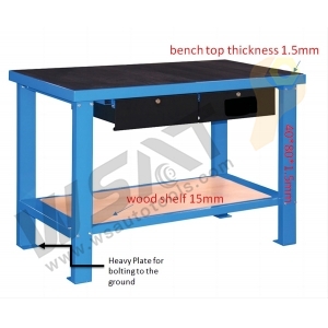 Heavy duty wood shelf with steel frame and cross beam reinforcement.